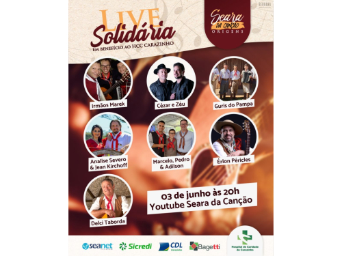 A Associação Seara de Arte e Cultura Gaúcha irá promover, nesta quarta-feira, 03 de junho, a partir das 20h, a Live Solidária Seara da Canção, em benefício do Hospital de Caridade de Carazinho.