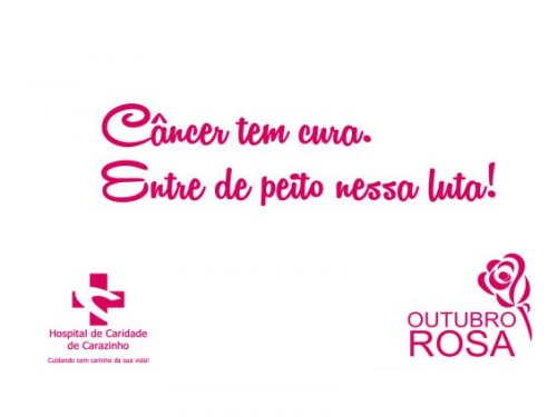 “Câncer tem cura. Entre de peito nesta luta”. Esta é a frase para a campanha Outubro Rosa 2015. Você, aluno de Carazinho, pode ser o criador da frase para a campanha Outubro Rosa 2016; para isso acontecer, basta você nos encaminhar sua frase por mensagem (inbox) através da nossa página do Facebook www.facebook.com/hospitaldecaridadedecarazinho.