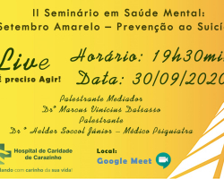 A live acontece no dia 30 de setembro, como encerramento do mês Setembro Amarelo, às 19h30min e será pela plataforma Google Meet. Toda comunidade hospitalar, bem como a comunidade de Carazinho e região estão convidados a participar do evento. As vagas são limitadas.