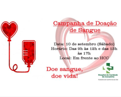 A terceira edição da Campanha de Doação de Sangue, promovida pelo Hospital de Caridade de Carazinho, em parceria com o Hemocentro de Passo Fundo (Hemopasso) e com apoio da Secretaria Municipal de Saúde, acontecerá no próximo sábado (10). A ação será realizada em frente ao HCC, das 9h às 12h e das 13h às 17h.